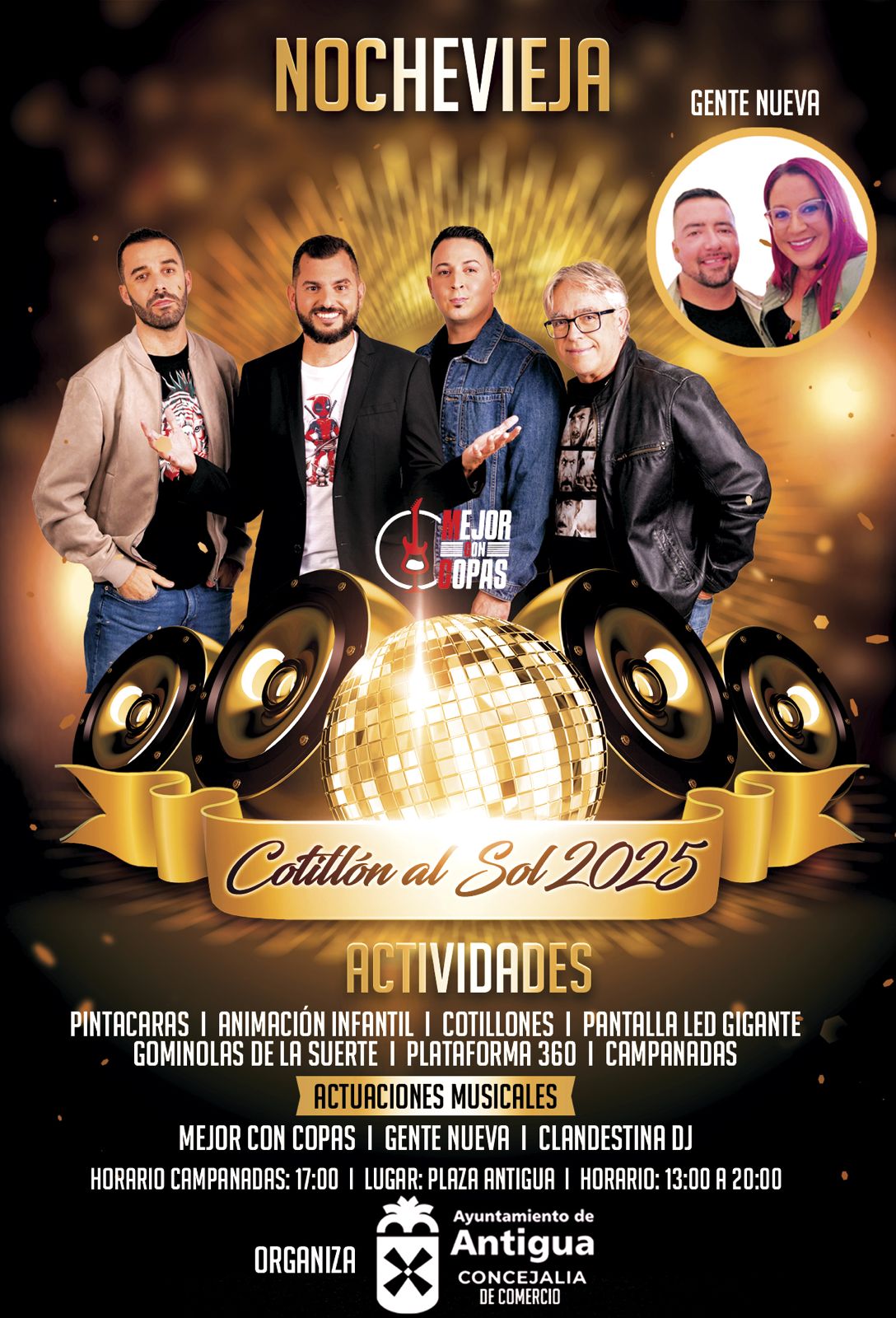 El Ayuntamiento de Antigua organiza como cada año, el tradicional Cotillón al Sol 2025, en esta ocasión desde la concejalía de Comercio que dirige Giuseppe Signorino, ofreciendo una cita para todos los públicos, tanto para grupos de amigos como para jóvenes y mayores que quieran disfrutar de juegos en la plaza, actuaciones musicales destacadas y por supuesto, afirma el alcalde, Matías Peña García, las campanadas al sol con divertido cotillón a las 17:00 horas en la plaza de Antigua el último día del año, el próximo miércoles 31 de diciembre.