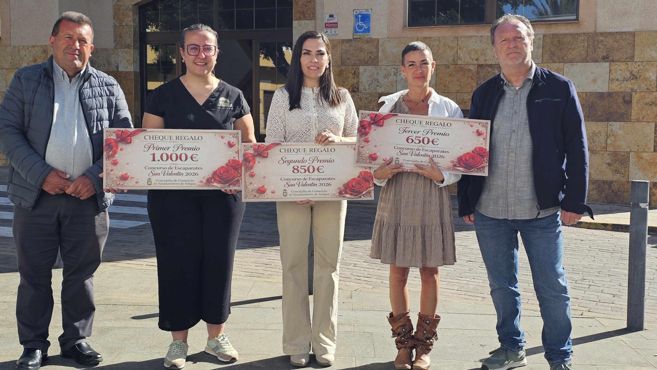 • El Concurso de Escaparates San Valentín 2026 entrega 1.000 euros como primer premio a la Carnicería de Antigua de Tanausu J. Gutiérrez Alonso, 850 euros como segundo premio a Modas Emma en Antigua de Suleima Martín Martín y 650 euros como tercer premio a Loveliness Beauty Care & Hair Styla de Debora Favalli en Caleta de Fuste.