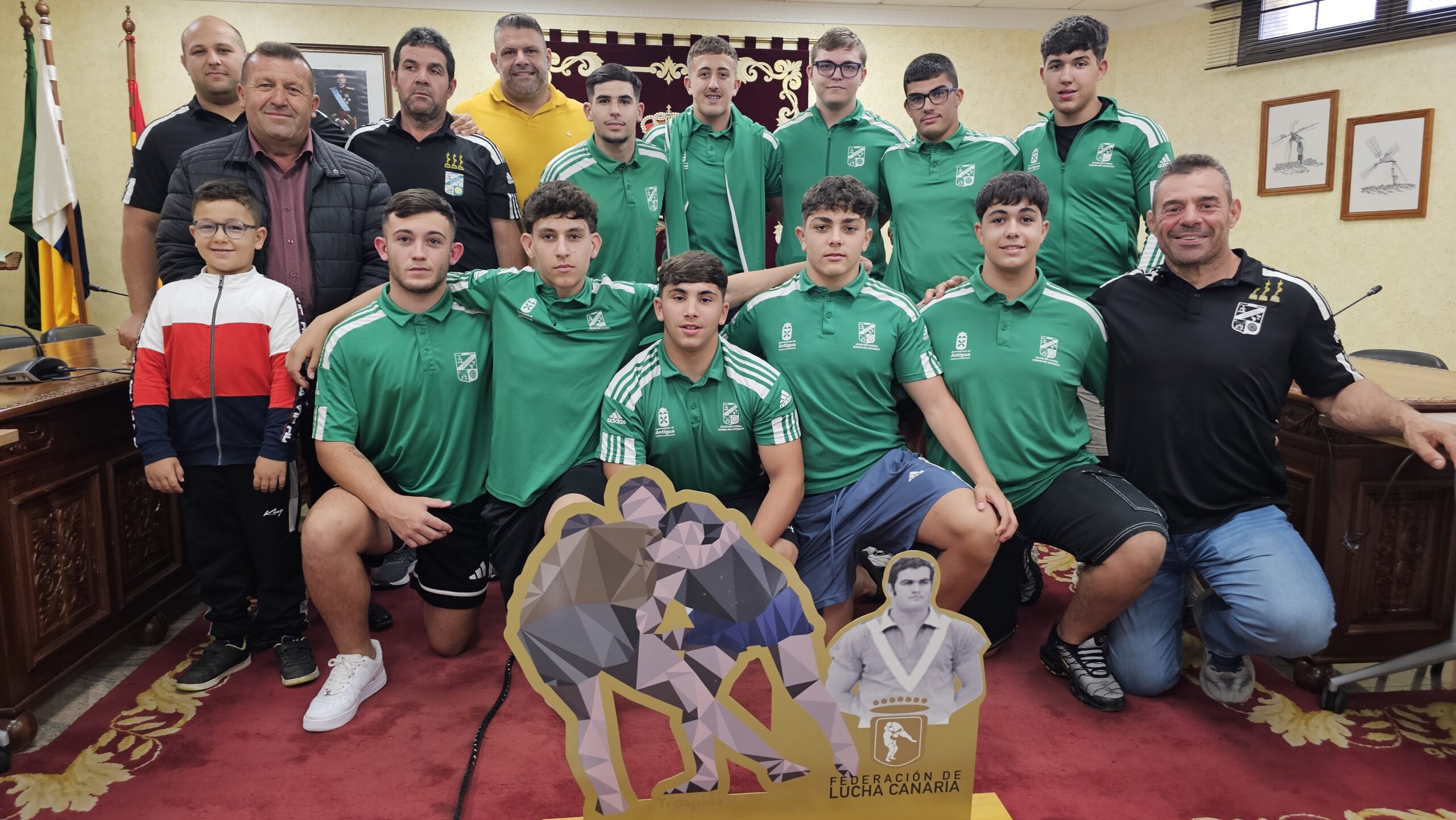 • El alcalde, Matías Peña García y el concejal de Deportes, Samuel Torres Mesa, recibían este miércoles por la tarde al equipo cadete del CL Unión Antigua en el salón principal del Consistorio Municipal para felicitarles como Campeones del Torneo regional de Lucha Canaria Juan Barbuzano.