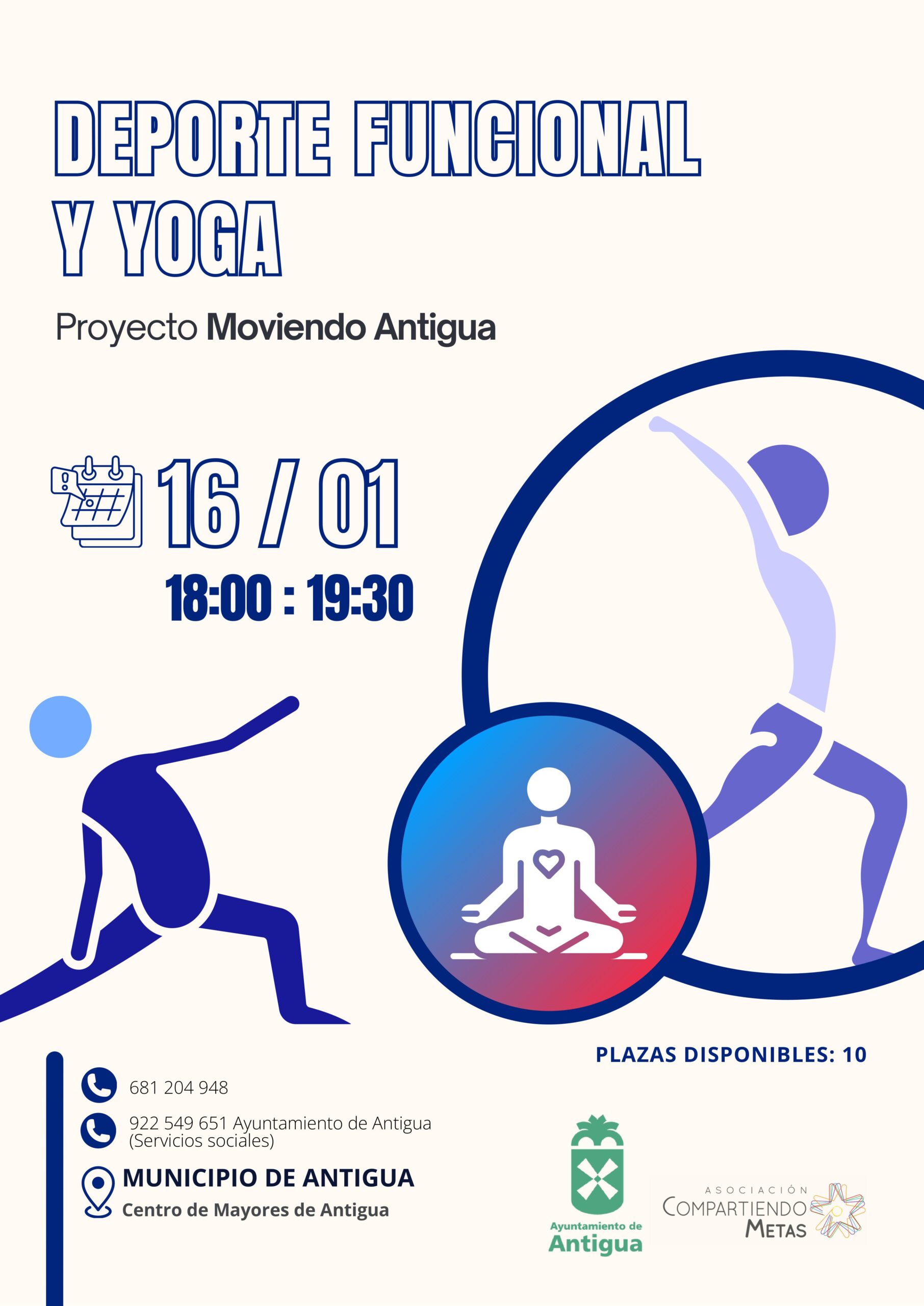 Este mes de enero, organiza dos talleres gratuitos, ambos en viernes por la tarde en horario de 18:00 a 19:30 horas en el Centro de Mayores de Antigua, y detalla la concejal, el 16 de enero una sesión de Deporte Funcional y Yoga, enfocada en la práctica combinada de disciplinas dinámicas y relajantes.