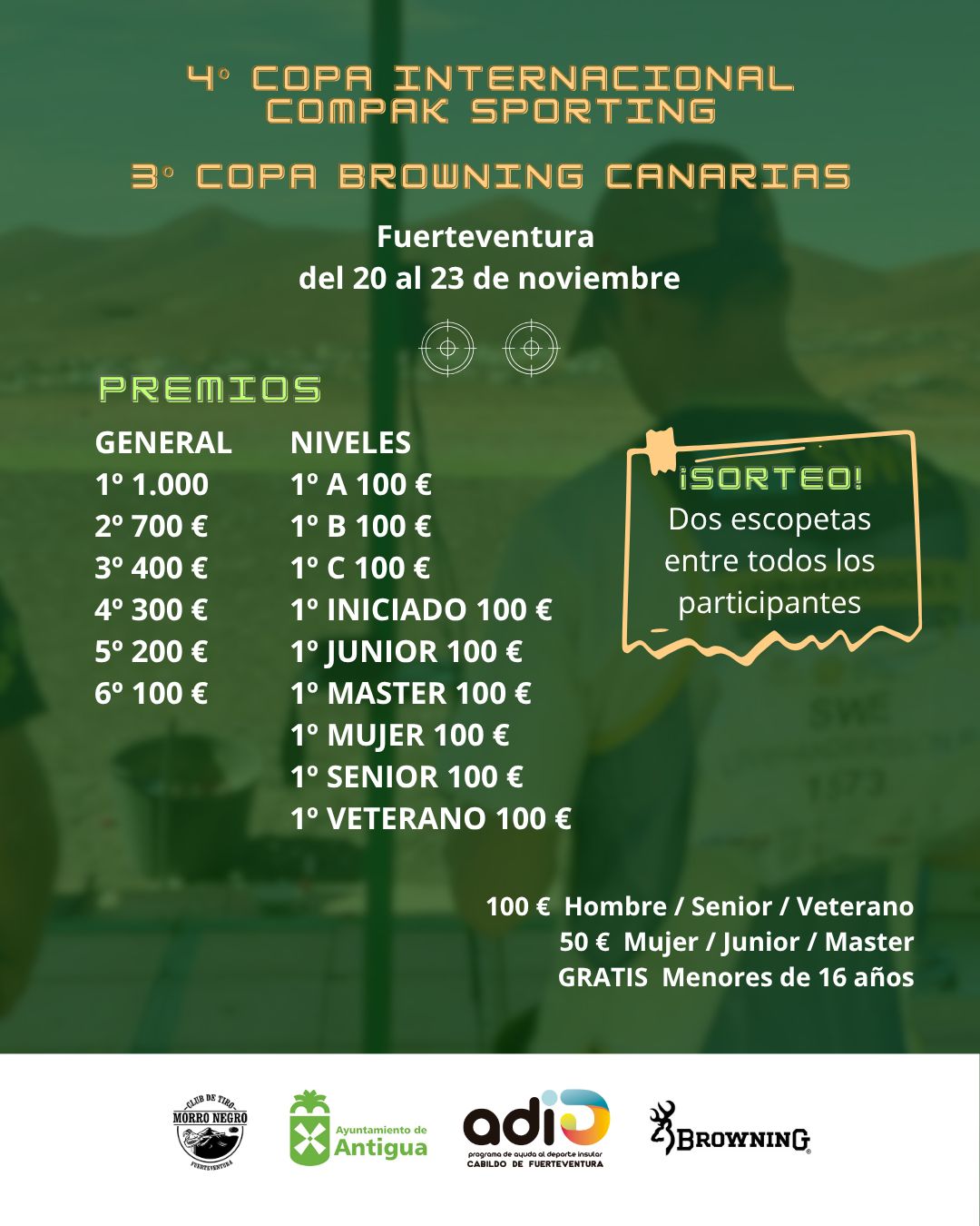 Este fin de semana, desde este jueves 20 y hasta el domingo 23 de noviembre, se celebra la IV Copa Internacional Compak Sporting y III Copa Browning Canarias, alcanzando por primera vez, el centenar de participantes de todas las islas canarias, siendo los inscritos de Fuerteventura mayoritariamente de Antigua, y destacando entre todos los inscritos, campeones regionales, nacionales y europeos, como Manuel Carrasco de Sevilla.