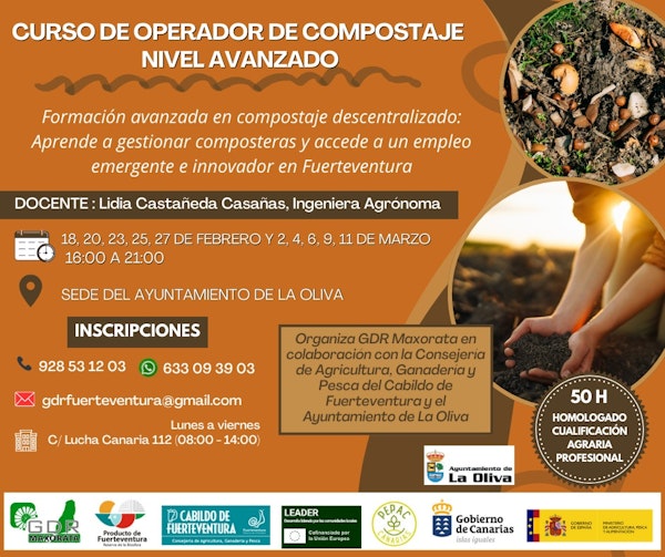 La Asociación para la Gestión del Desarrollo Rural Maxorata Verde (GDR-Maxorata) y el Cabildo de Fuerteventura, a través de la Consejería de Agricultura, Ganadería y Pesca, que dirige Matías Peña, continúan con su programa de cursos formativos para el año 2026, gracias a la financiación de la Intervención 7119 del PEPAC 2023-2027 que reciben los grupos Leader. En este caso, con un curso de operador de compostaje de nivel avanzado para aprender a gestionar composteras y acceder a un empleo emergente e innovador en Fuerteventura.