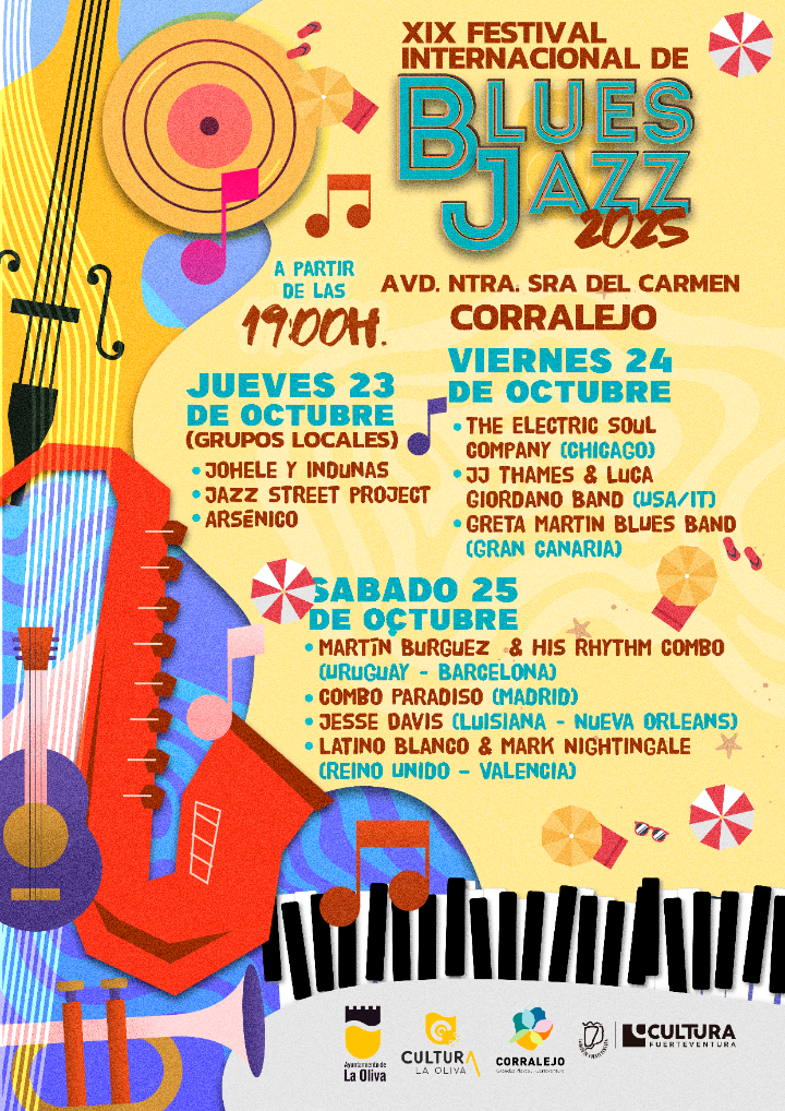 Para rematar el encuentro, el sábado 25 de octubre Corralejo será testigo de la música de Combo Paraiso (Madrid, Latino Blanco & Mark Nightingale (Reino Unido – Valencia) y Jesse David (Luisiana – Nueva Orleans), coronando la gran noche del Jazz.