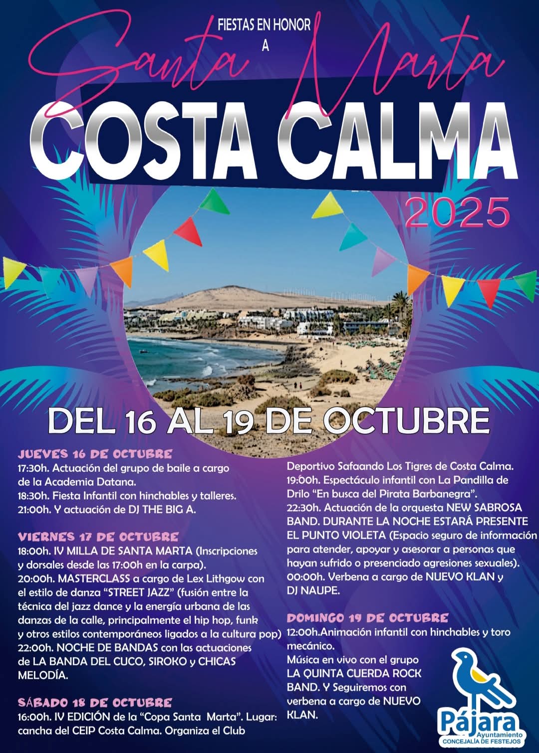 El Ayuntamiento de Pájara, a través de la Concejalía de Festejos, presenta la programación de las fiestas en honor a Santa Marta, en Costa Calma, que se celebrará del jueves 16 al domingo 19 de octubre, con actividades para todos los públicos, música en vivo, espectáculos infantiles y deporte.