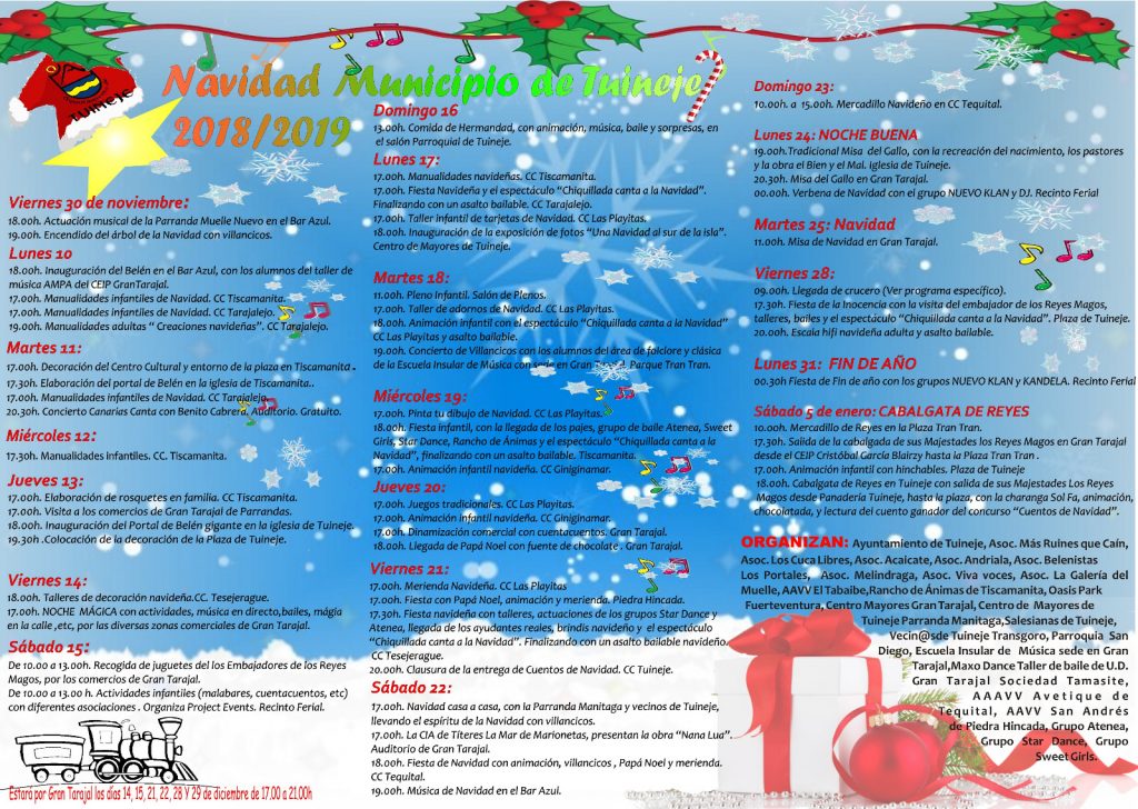 A partir de las 18:00 horas, sus Majestades los Reyes de Oriente se trasladarán hasta el pueblo de Tuinejepara participar en la Cabalgata cuya salida está prevista en la Panadería de Tuineje, para llegar a la Plaza de San Miguel. Acompañados de la Charanga Sol Fa, la jornada incluye una tarde de diversión con animación infantil, chocolatada y la lectura del cuento ganador del concurso ‘Cuento de Navidad’.