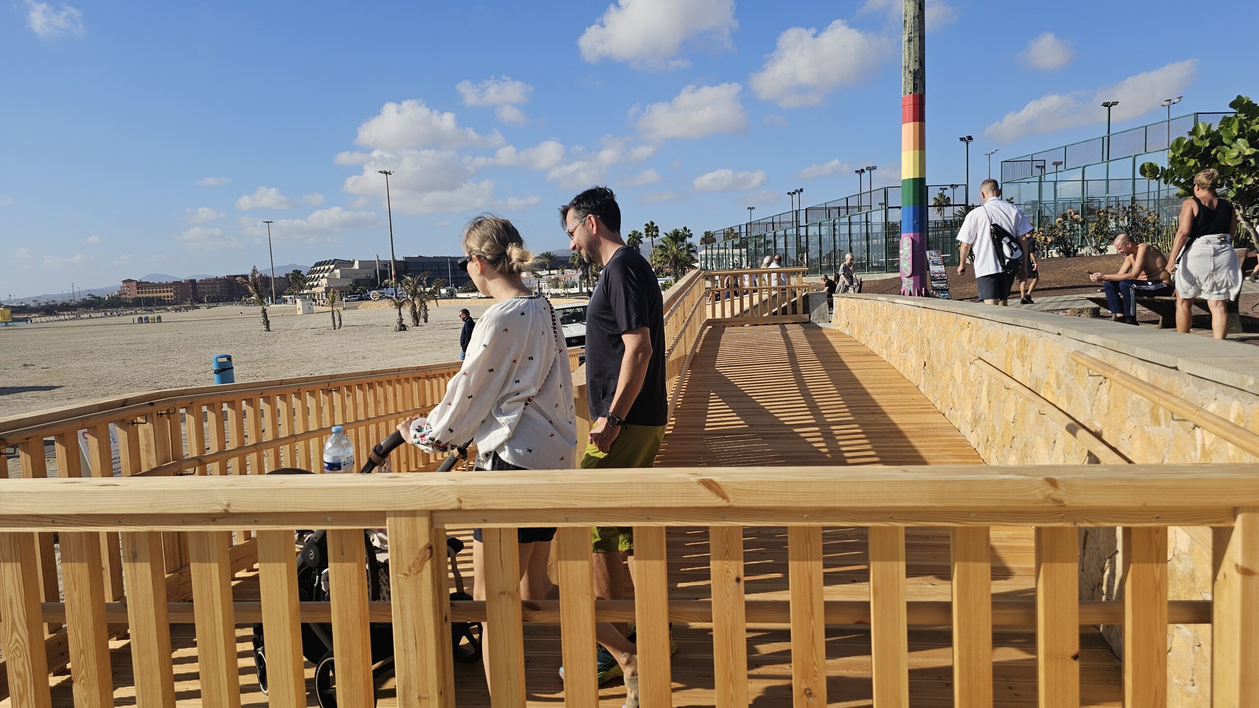 Las dos pasarelas que presenta la rampa de accesibilidad son de madera, recubiertas de una barrera de protección en sus laterales, y permiten el acceso a la zona céntrica y de mayor uso de la playa, salvando una altura de dos metros desde la acera a la arena, disponiendo hasta el momento sólo de escaleras que ahora podrán evitarse en beneficio de todos, afirma el concejal Signorino.