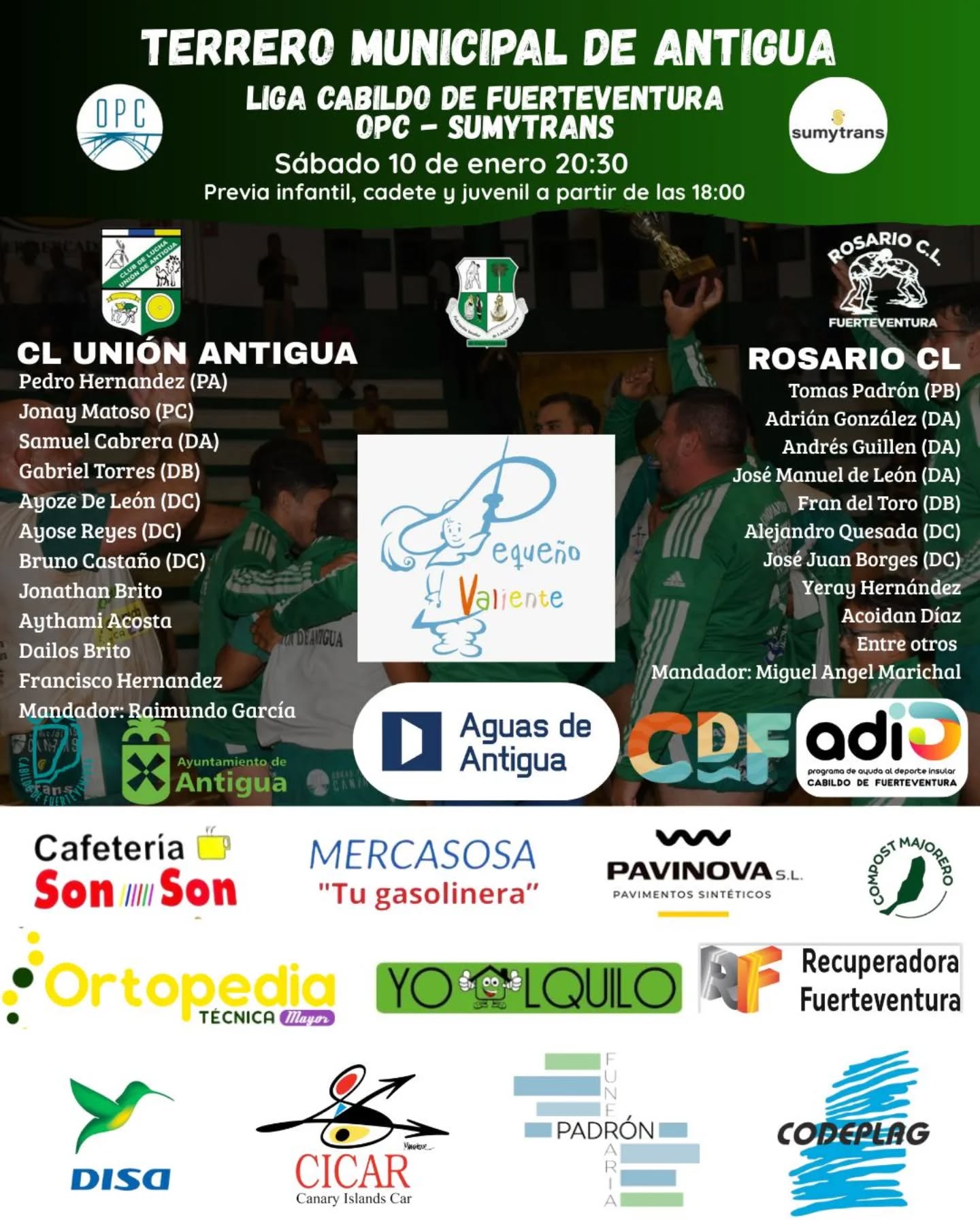 El Ayuntamiento de Antigua colabora en la Lucha Solidaria que organiza el CL Unión Antigua este sábado 10 de enero a partir de las 20:30 horas, en el Terrero de Lucha Municipal, destinando la totalidad recaudada de la entrada a la Fundación Pequeño Valiente.