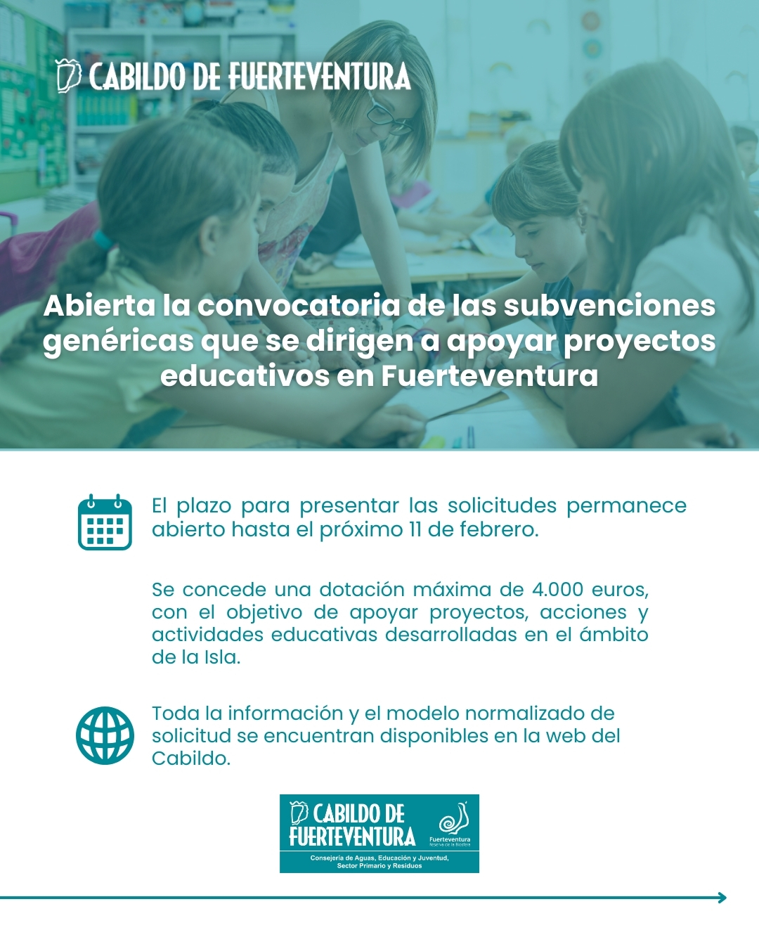 El Cabildo de Fuerteventura, a través de la Consejería de Educación, ha abierto la convocatoria de las subvenciones genéricas que se dirigen a apoyar proyectos educativos en la Isla. El plazo para presentar las solicitudes permanece abierto hasta el próximo 11 de febrero.