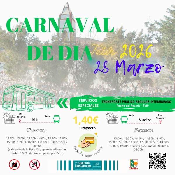 El Cabildo de Fuerteventura, a través de la Consejería de Transportes y la empresa que presta el servicio de transporte regular interurbano de viajeros, establece servicios especiales de guaguas con motivo del Carnaval de Día de Tetir que se celebra el sábado, 28 de marzo.