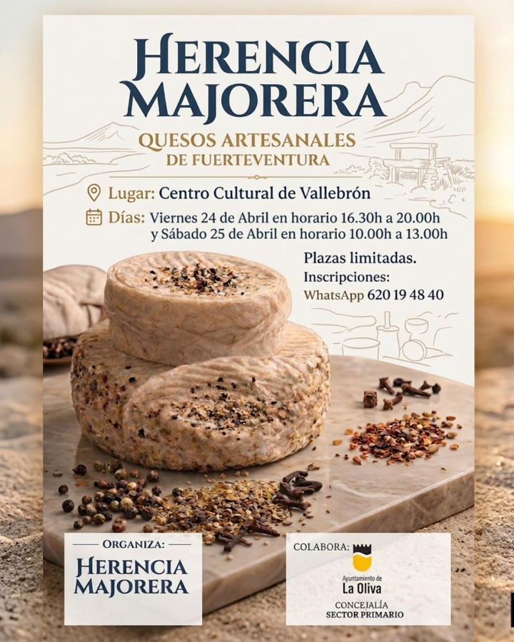 La elaboración del queso artesanal majorero se convierte en el eje central de “Herencia Majorera”. El Ayuntamiento de La Oliva, a través de la Concejalía de Sector Primario, que gestiona Rubén González, impulsa un taller formativo abierto a la ciudadanía que pretende que la tradición e identidad de Fuerteventura perviva en las futuras generaciones presentado por Cristian Vera Cabrera. Así pues, durante los próximos 24 y 25 de abril, el Centro Cultural de Vallebrón acogerá a un total de 20 personas para descubrir la historia del queso en Fuerteventura, la importancia de la cabra majorera en la economía tradicional y el proceso artesanal completo de elaboración queso (ordeño, cuajado, corte de la cuajada, moldeado, prensado, salado y curación).