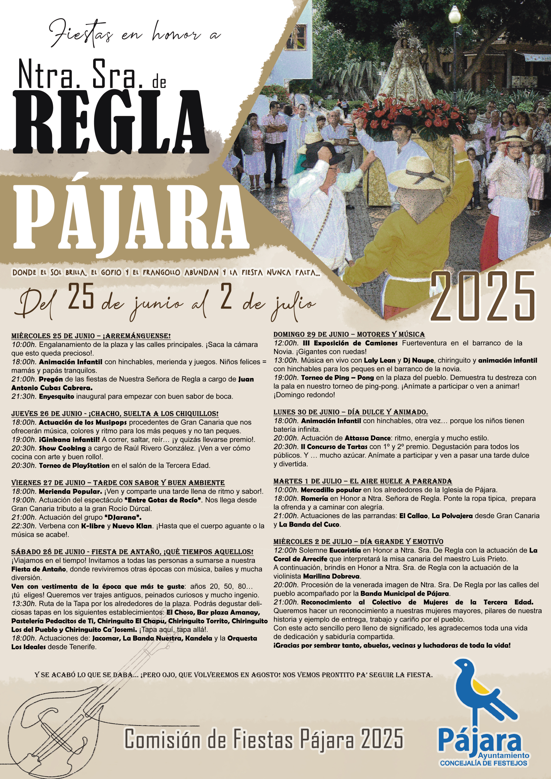 Il Comune di Pájara, attraverso l’Assessorato alle Feste, presenta il programma dei festeggiamenti in onore di Nuestra Señora de Regla, che si svolgeranno dal 25 giugno al 2 luglio nella città di Pájara. Il programma prevede un’ampia varietà di eventi culturali, religiosi e festivi rivolti a tutti i pubblici, con proposte che vanno da spettacoli musicali, tornei e ginkana per bambini, a un mercato di strada, concorsi, balli all’aperto e molte altre attività.