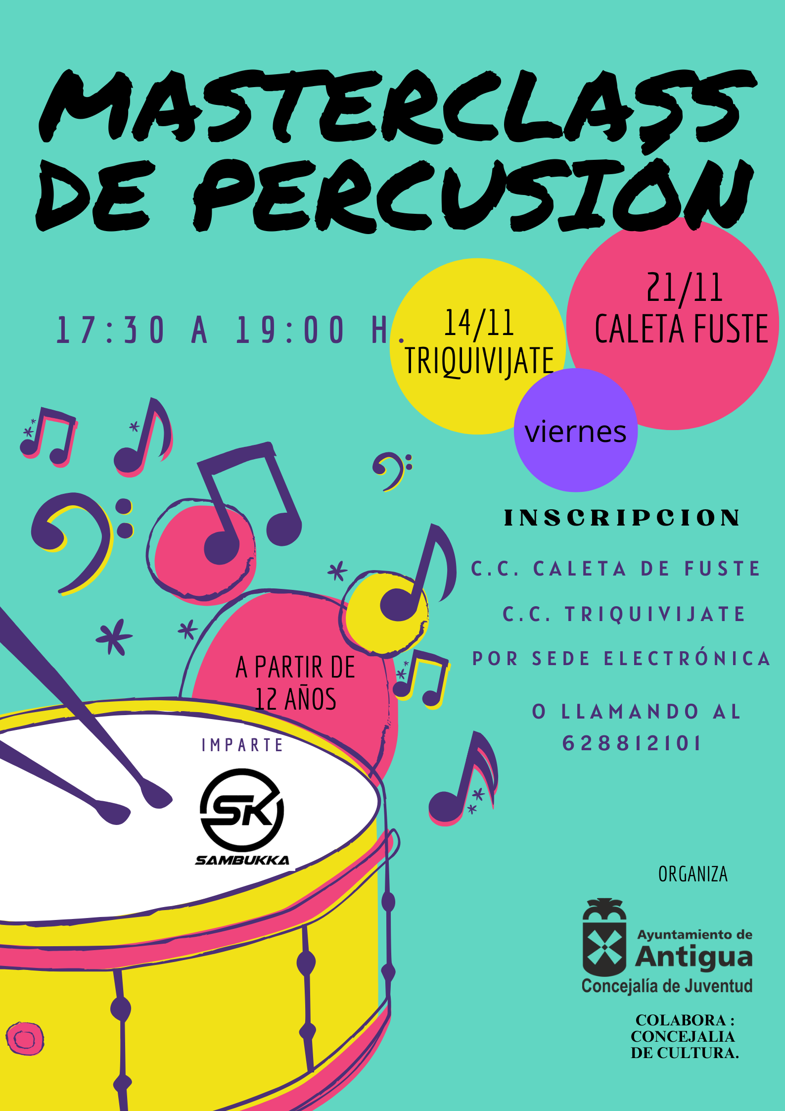 • La Masterclass de Percusión es de inscripción gratuita y se imparte de 17:30 horas a 19:00 horas este viernes 14 de noviembre en Triquivijate y el próximo 21 en el mismo horario de tarde en Caleta de Fuste.