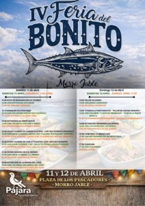 La IV Feria del Bonito y del Atún comenzará el sábado 11 de abril, a las 12.00 horas, la inauguración y el atún rojo. A las 14:00 horas actuará el grupo musical Gente Nueva y, a continuación, habrá varios show cookings a cargo de la chef del restaurante Desértico, Lorena Placeres, a las 16:30 horas; de la chef del restaurante Lapa, Carlota Espino, y a las 17:30 horas, de X El Morro. El día finalizará al ritmo de Banda del Cuco.
